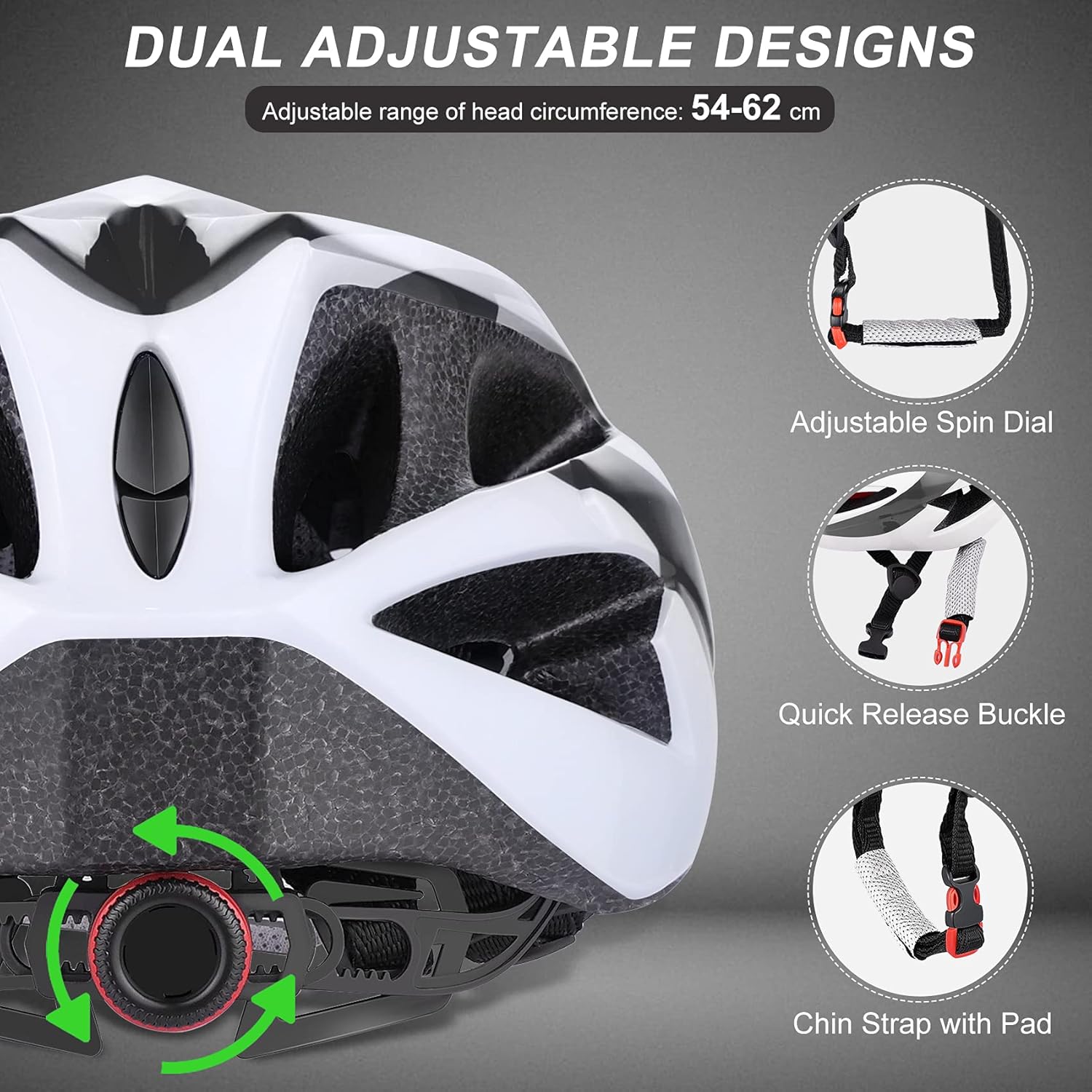 • ADJUSTABLE AND FIT: Thanks to its adjustable dial system and side straps, the bike helmet can accommodate heads of all sizes, with a custom fit and fit for most teens and adults. Suggested head circumference: 54-62CM (please measure your head before purchasing.)