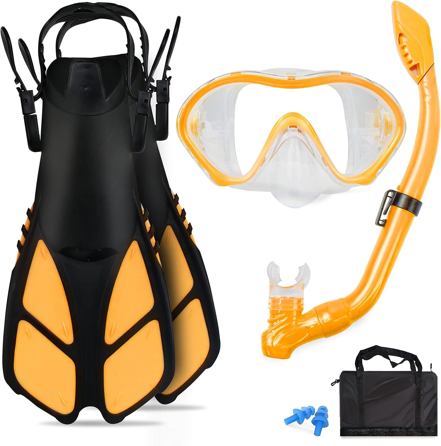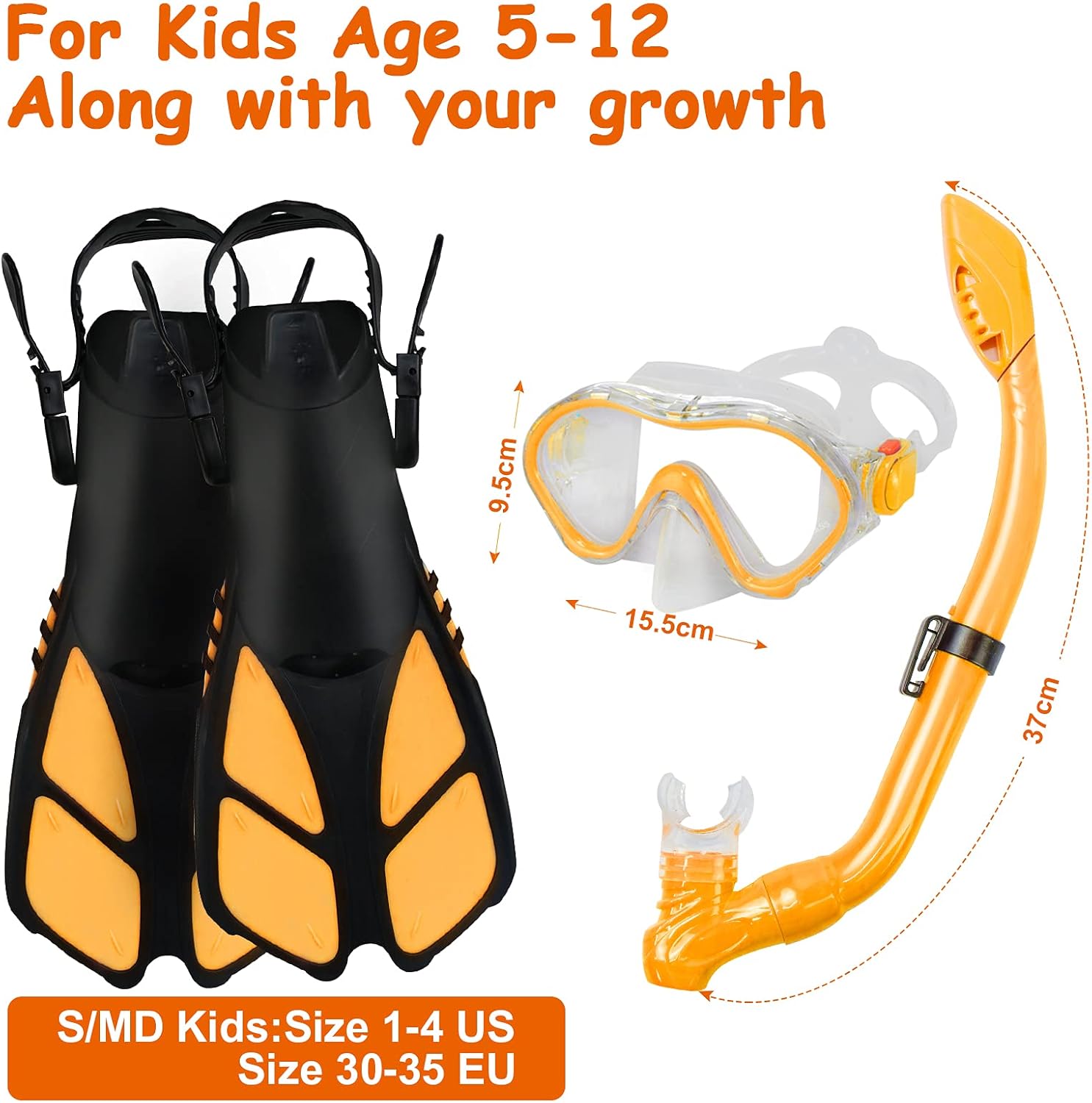 Kids Snorkeling Set with Flippers/Fins + Panoramic Snorkel Mask + Dry Top Snorkel + Travel Bags,Snorkeling Gear for Kids,Juniors,Boys and Girls Age 5-12